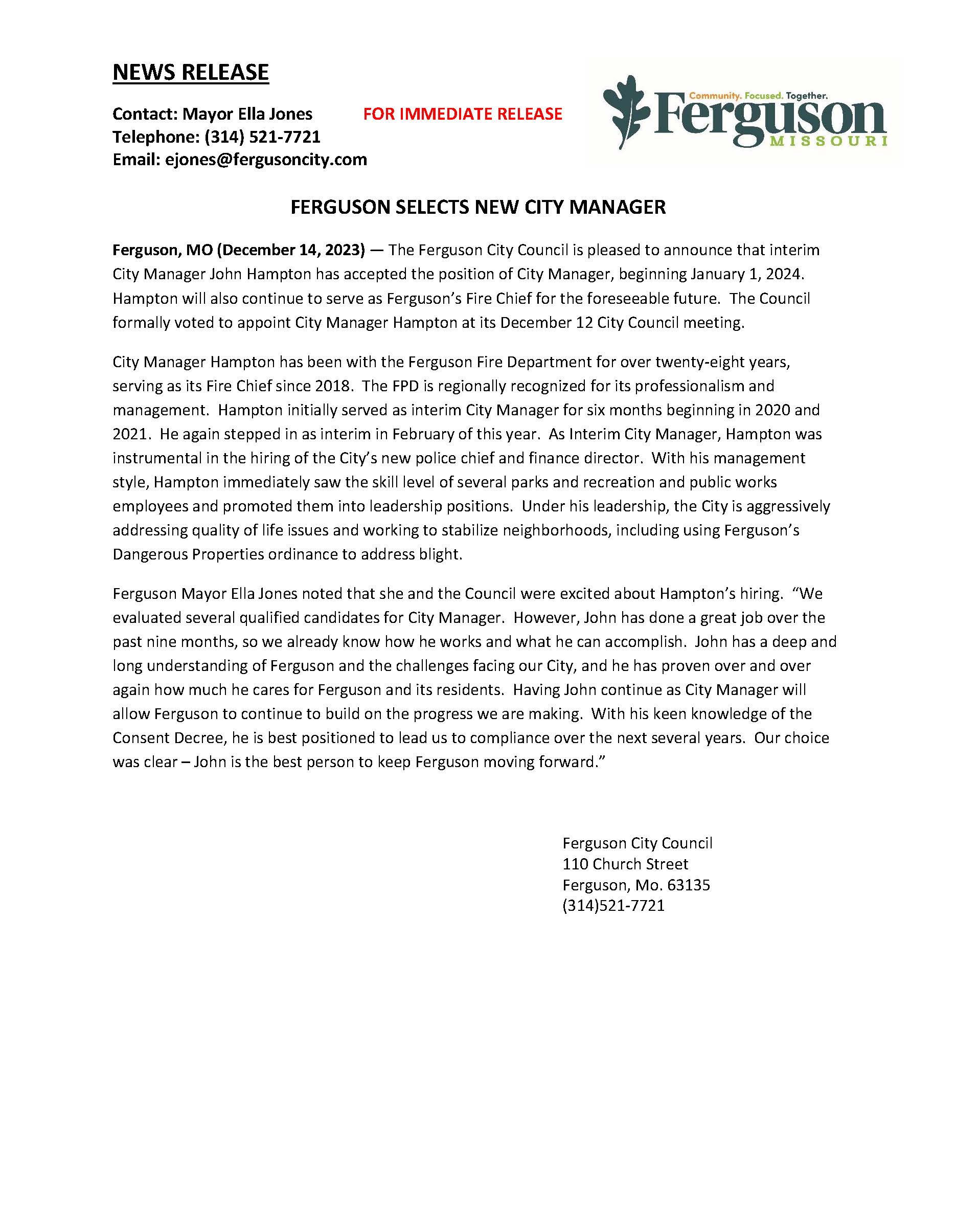[ARCHIVED] The City of Ferguson Appoints a New City Manager